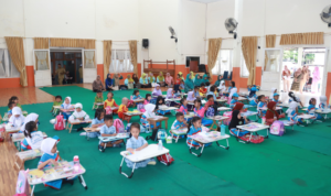 PONTIANAK – Sejumlah anak-anak antusias mengikuti lomba mewarnai yang digelar di Kantor Kecamatan Pontianak Timur, Selasa (6/8/2024).